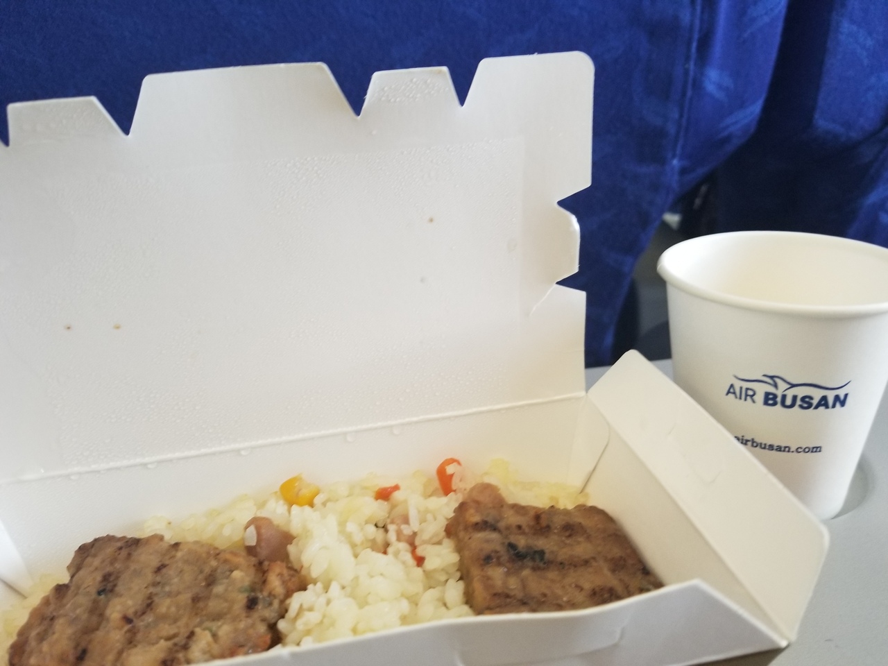 成田ー釜山便を利用。LCCですが機内食と飲み物のサービスがありました。飲み物はオレンジジュースと水、食事は紙のパックに入った炒飯。行きは海鮮、帰りはお肉でした。温かい状態で提供され、お味もなかなか美味しかったです。そしてなにより座席が広い!!前の座席に膝があたるようなこともなく広々でした。