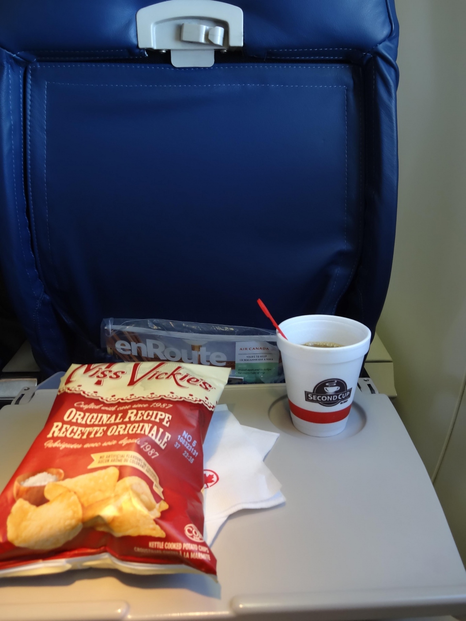 モントリオールからトロントシティの空港(ピアソンではない方)へのフライトはエアカナダの子会社の運行でした。1時間ほどのフライトだけど、サービスのスナックは袋菓子やチョコレートなどコンビニに売ってそうなサイズでいくつかの種類の中から好きなのを選べたのが庶民には太っ腹に思えました。笑。