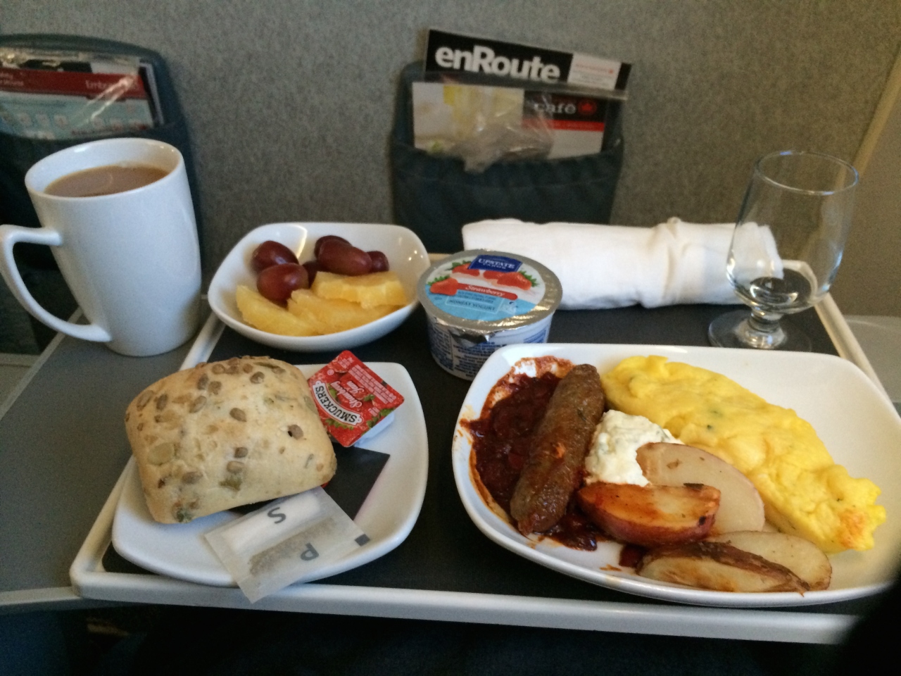ボストン→トロント経由→羽田行きで利用しました。エコノミーでした。飛行機内は広くて乗り心地は良かったです。食事は日本食、アメリカンから選べました。オムレツ、牛丼?など出ました。映画の本数が少なくて、もっとあればいいかなという感じです。到着間際になんと、カップヌードルが出ました!!久しぶりだったので美味しくいただきました。