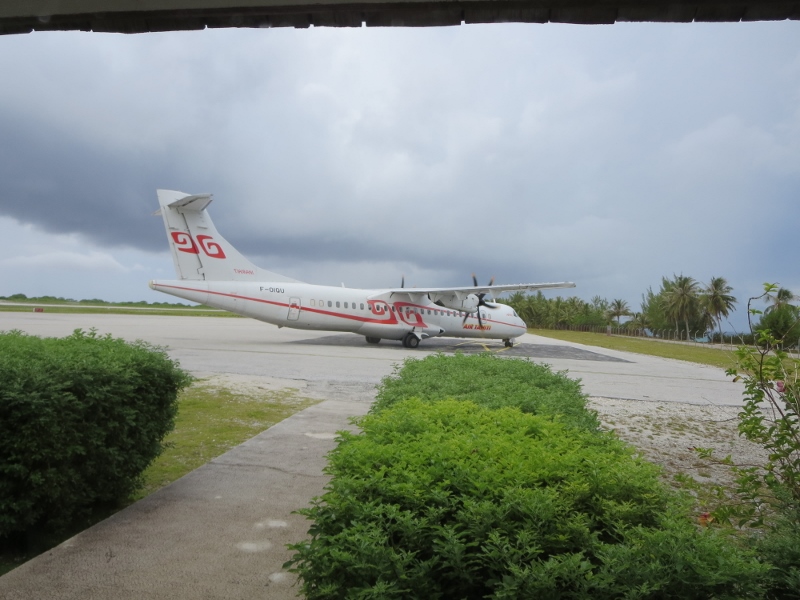 タヒチ島からランギロア島に行くときに乗りました。途中ティケハウ島に寄りました。空から見ると、ランギロア環礁が巨大な途切れたゴム輪のように見えてきました。機内は観光客の他、地元の人も乗っていました。ティケハウに着くと、半分位の人が降りました。飛行機まで歩いてタラップから乗るのが、空の旅へのワクワクした気分を誘います。短い時間なので機内サービスはジュースだけでした。