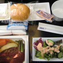 食事としては、エコノミークラスに加えて、ラタトゥイユ、シャンパン、アイスクリームなどのサービスが追加されているようでした。