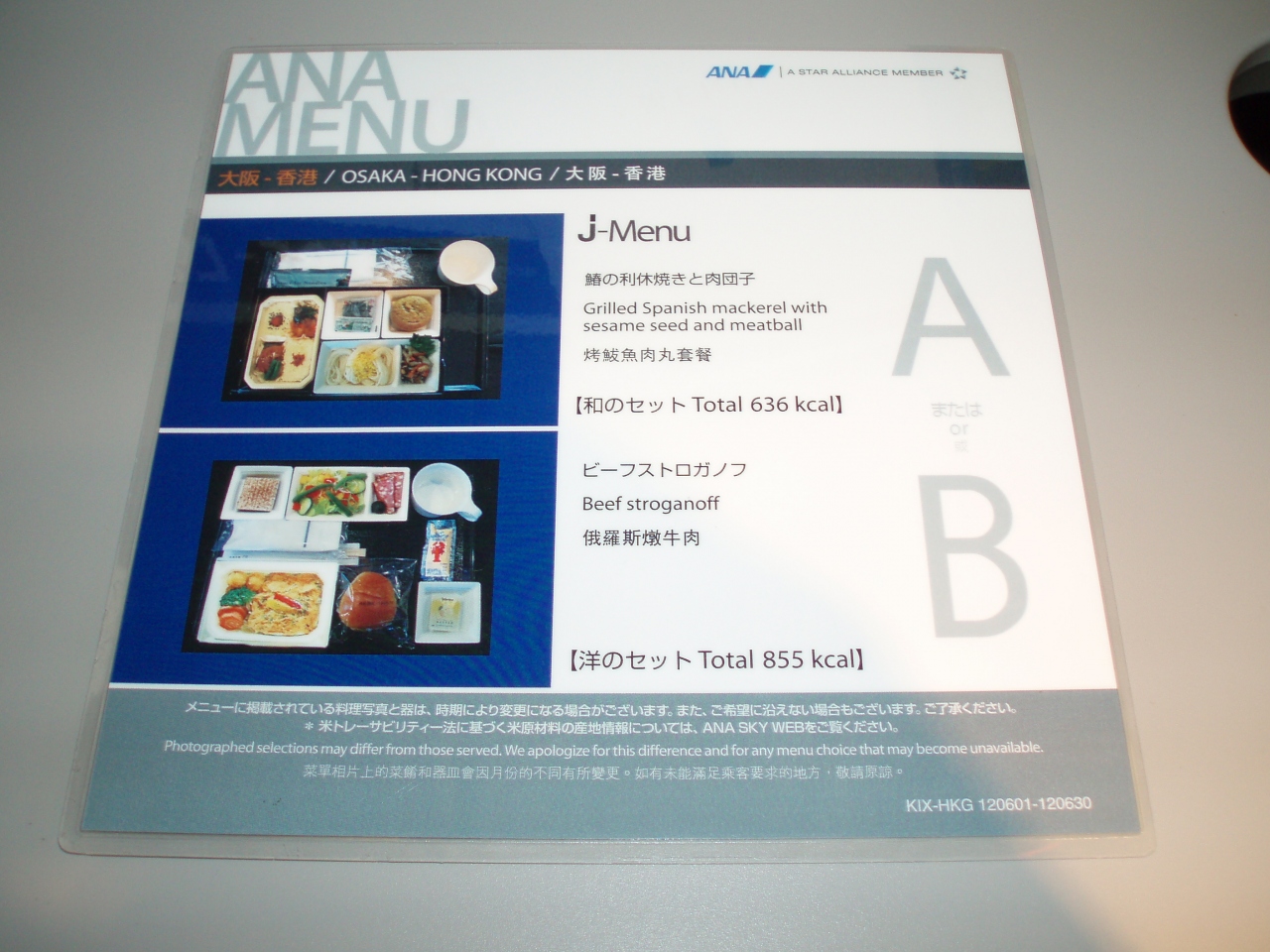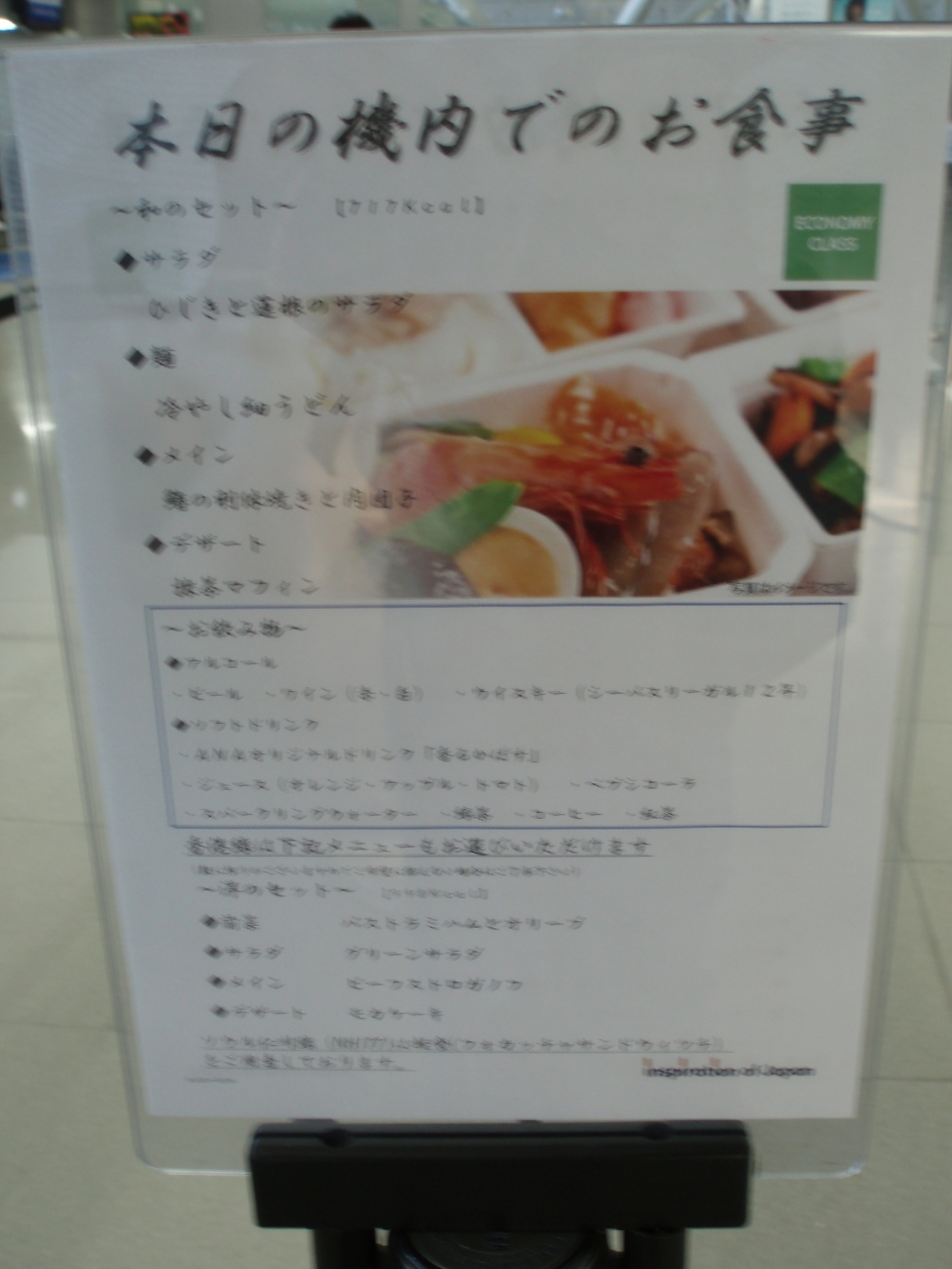 まず空港でチェックインカウンターの列の所に今日の機内食のメニュー案内の看板が有るのが宜しいし更に機内で乗務員がミール配膳中に見せる写真付きのメニューも以前より大きくなって見やすくなってました。
