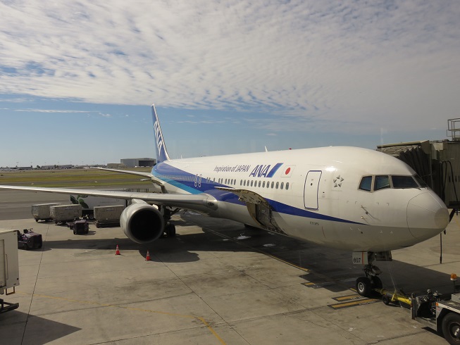 ハワイ行きの夜便で利用。機材の関係で1時間遅れとなりました。