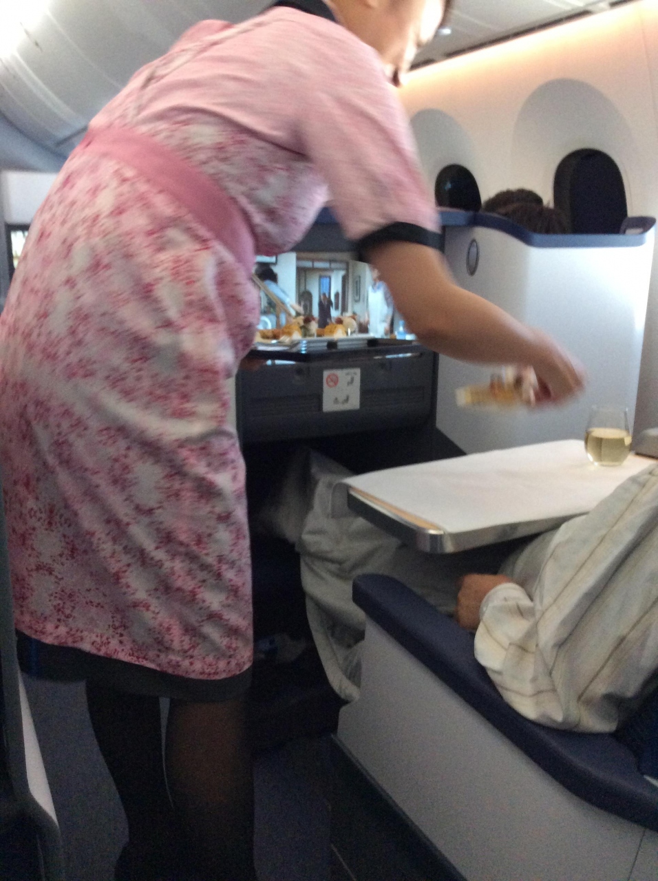 時差対応 / 現地7時間遅れです。12時30分搭乗後2時間してメイン料理が出ますが、現地では7時30