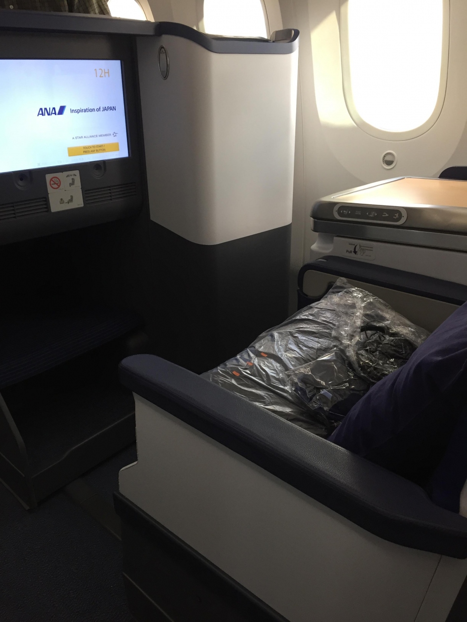 夕方出発の便で成田からバンコクまでビジネスクラスにて搭乗しました。飛行機まではバスで移動。なんだかLCCみたい。でも機内サービスはしっかりANAでした。シートはスタッガード仕様なので、楽ちんです。最近は東南アジアの中距離路線でもこの手の仕様が増えてきた印象です。機内食のサービスと内容欧米並みで満足でした。ただウエルカムシャンパンのコープが透明のプラスチックだったのが、なんともって感じでしたが。