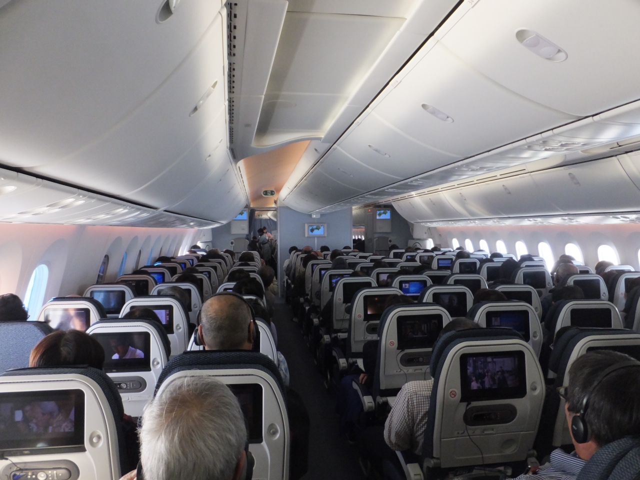 - 機材はB787。座席配置3:3:3の大型機。Yクラスでもウォシュレット付きのトイレがあったり。