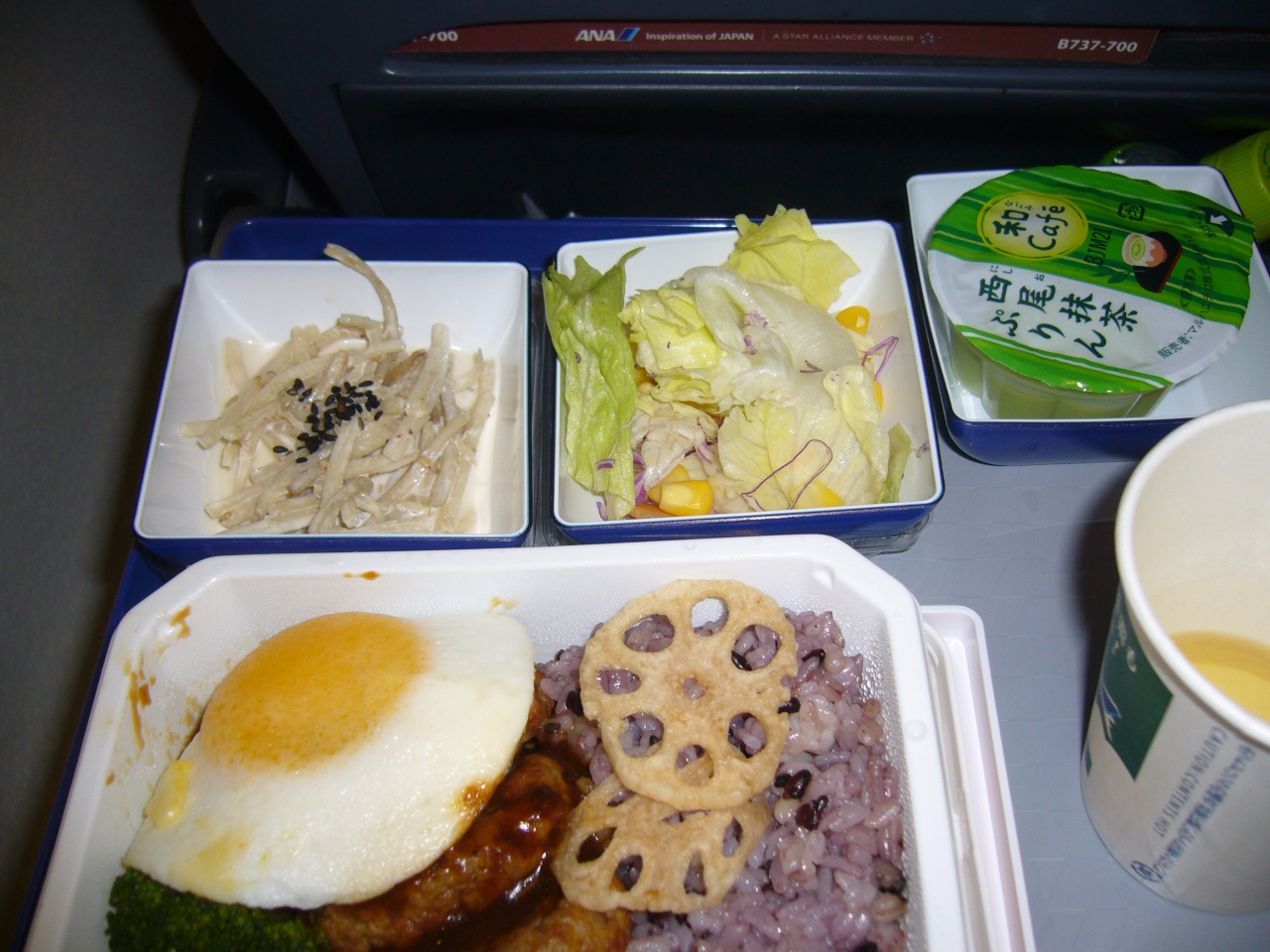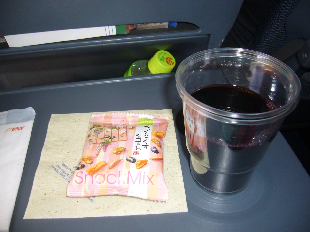 往路は気流が荒れ、やっとドリンクサービスが開始。赤ワイン(コップ並々)、ビールを頂きましたが、短い時間なのにドリンクとミールサービスがが別々にあります。
