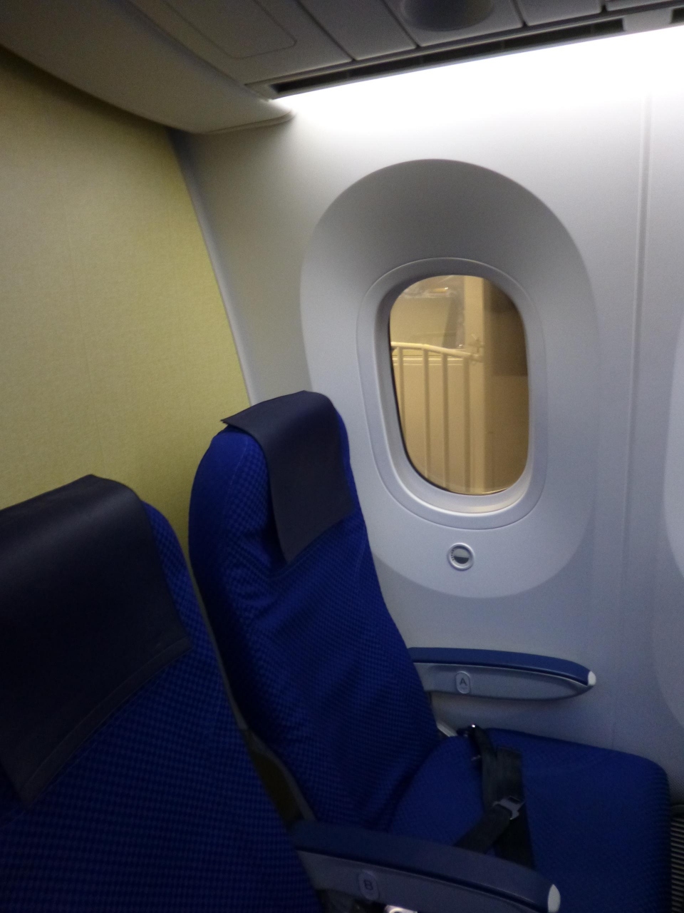 羽田空港から伊丹空港まで搭乗しました。機材はボーイング787型機ですが、当初の予定より座席数の多い機材に変更になったということで、空席がかなりありました。