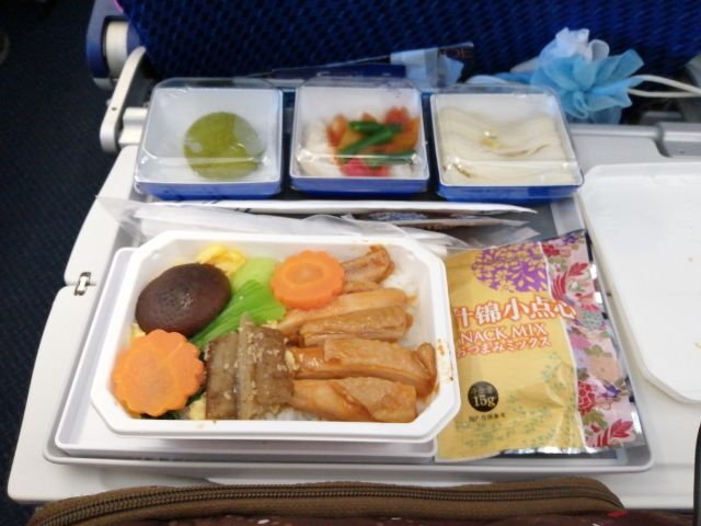 機内食は行きも帰りもご飯に具がのった丼で、とてもおいしかったです。