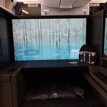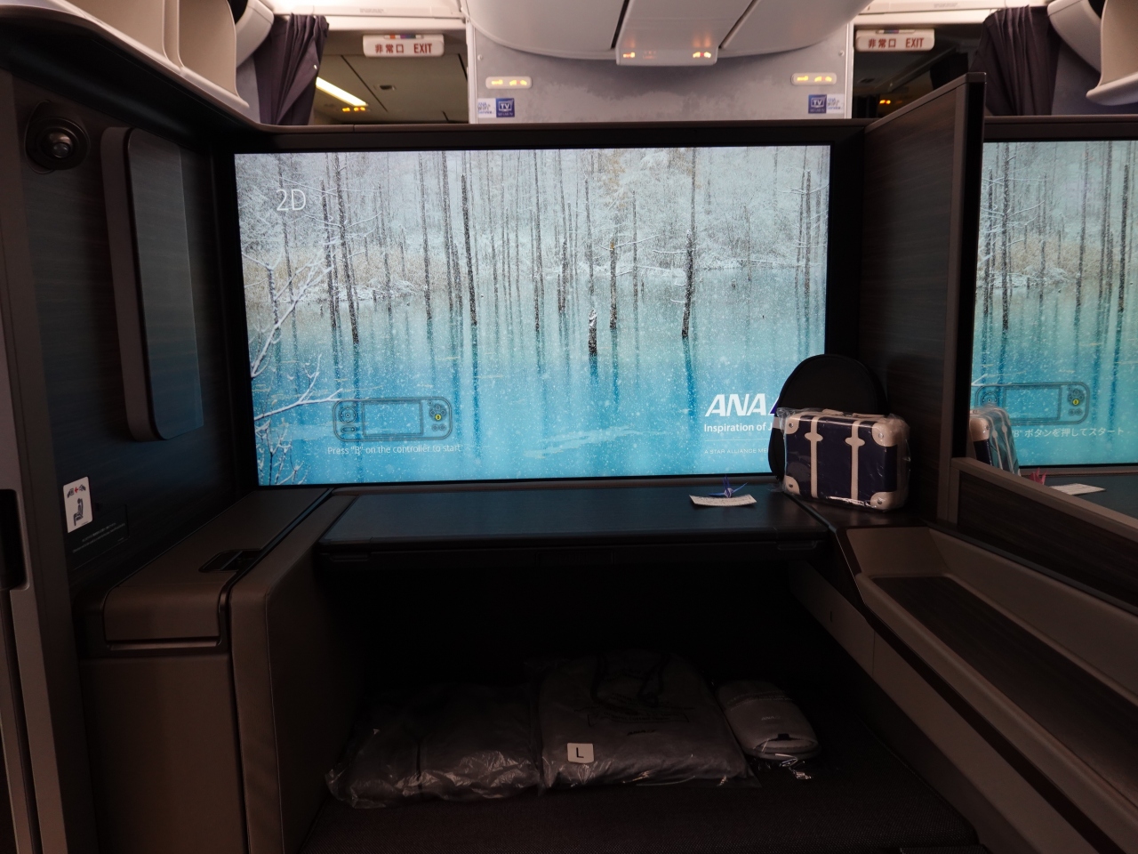 羽田空港からニューヨークのJFケネディ空港まで、ANAのファーストクラスに搭乗しました。機材は777で、シートは最新型のものでした。シート配列は1-2-1で、全8席です。