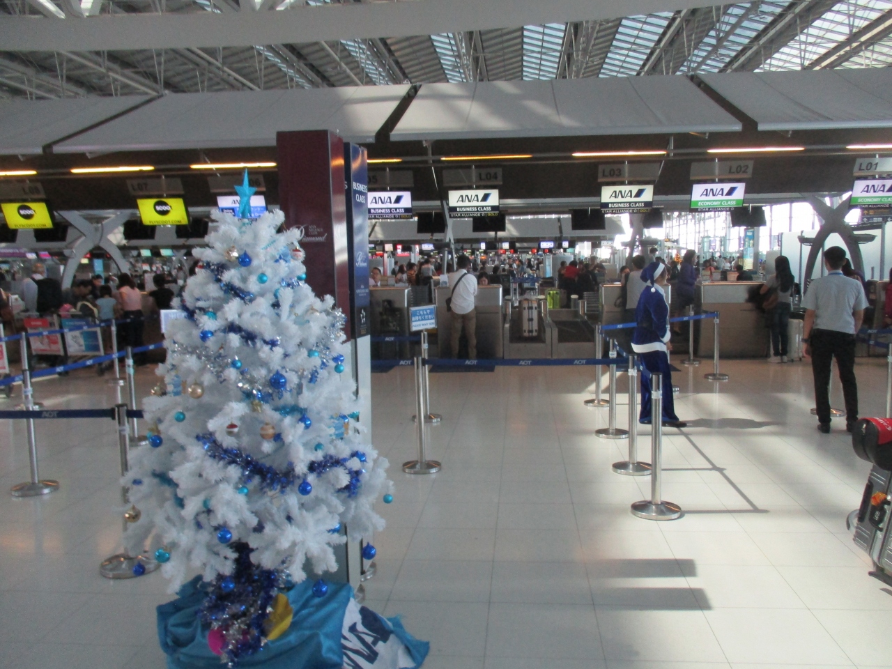 クリスマスの時期にANAを利用しました。2012年から毎年クリスマスシーズンはバンコクに訪問しますが、ほぼ毎回ANAさんにお世話になります。搭乗チェックインカウンターに素敵なクリスマスツリーがあり、思わず記念撮影しましたが、いつも以上に旅への期待が高まりました。