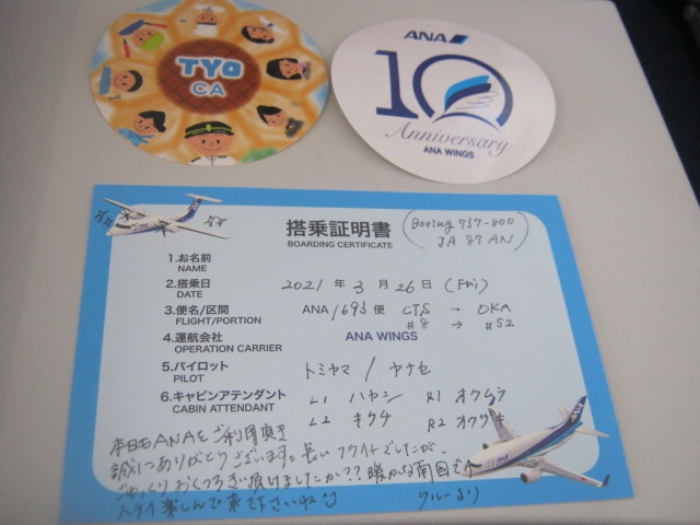 この三便搭乗を通じて思ったことは、やはりNHさんは、顧客サービスを最優先に取り組まれている、ということで、普段LCCに乗り慣れていると、平時から凄いサービスだなと感じてしまうものですが、コロナ禍のご時世においては、尚更という感じで、最初のMMB→CTSでは、飛行時間が短いので遠慮して、機番を尋ねるだけに止めていたのですが、大体こういうのを聞いてくる輩はマニアだから、という認識なんでしょう、こちらから何も申し上げていないのに、後程丁寧なコメントを記載された搭乗証明書まで頂いてしまい、申し訳ない気持ちになってしまいました。