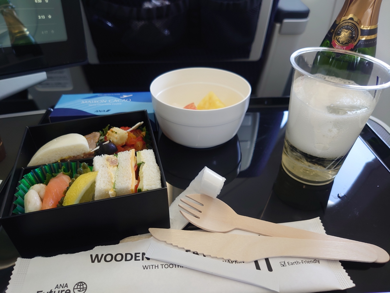 機内食は少し残念。軽食なので内容的はいいのですが、切れない木の食器もどき…。