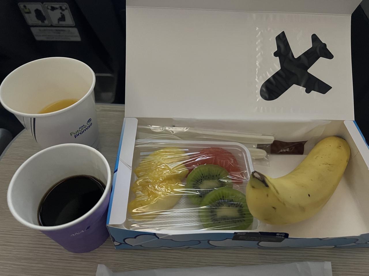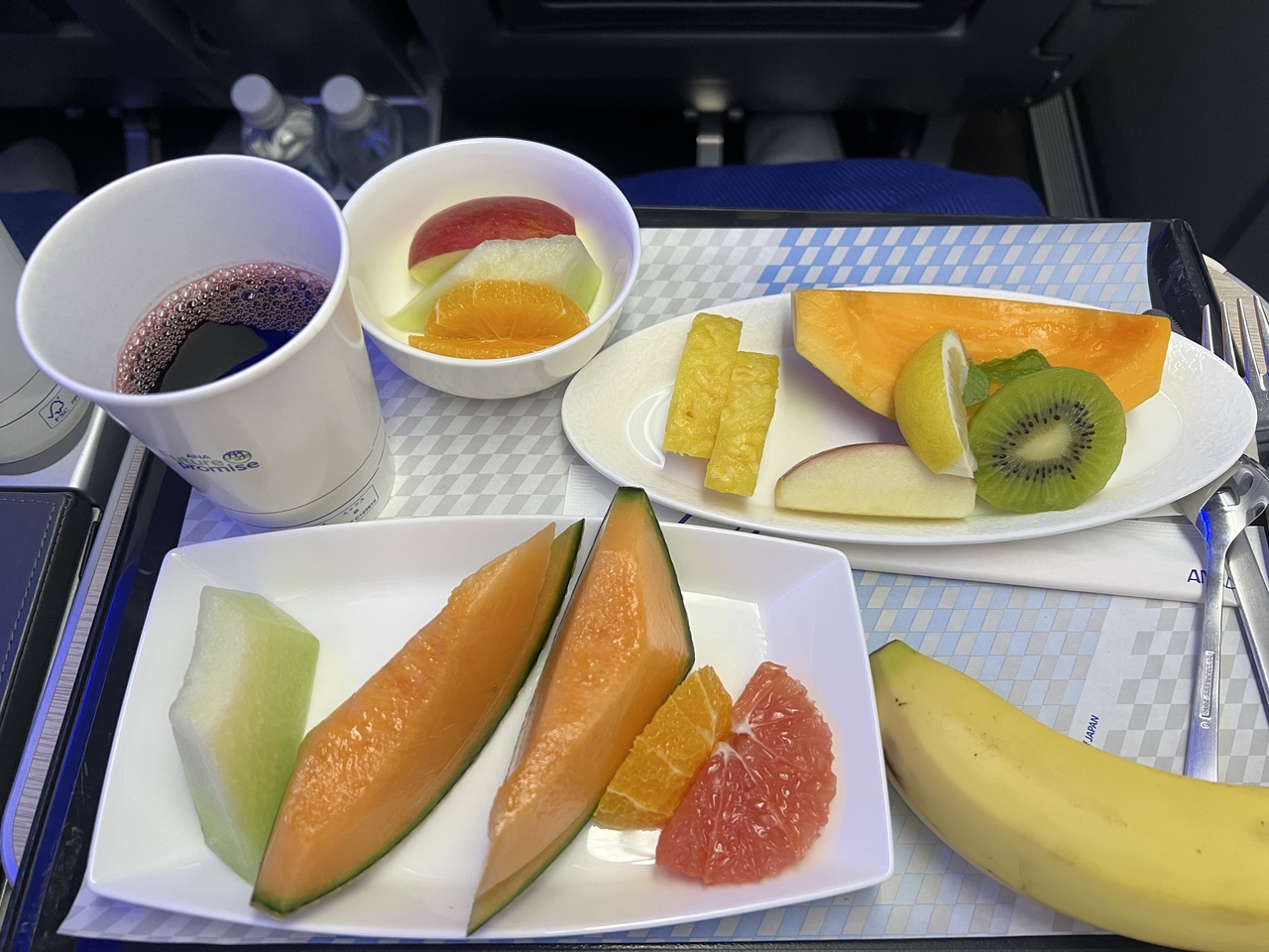 行きはラウンジで軽く食事をしたので、機内食全てフルーツミールにしました。