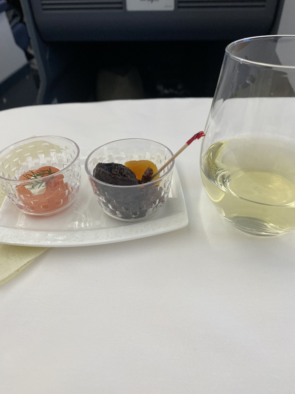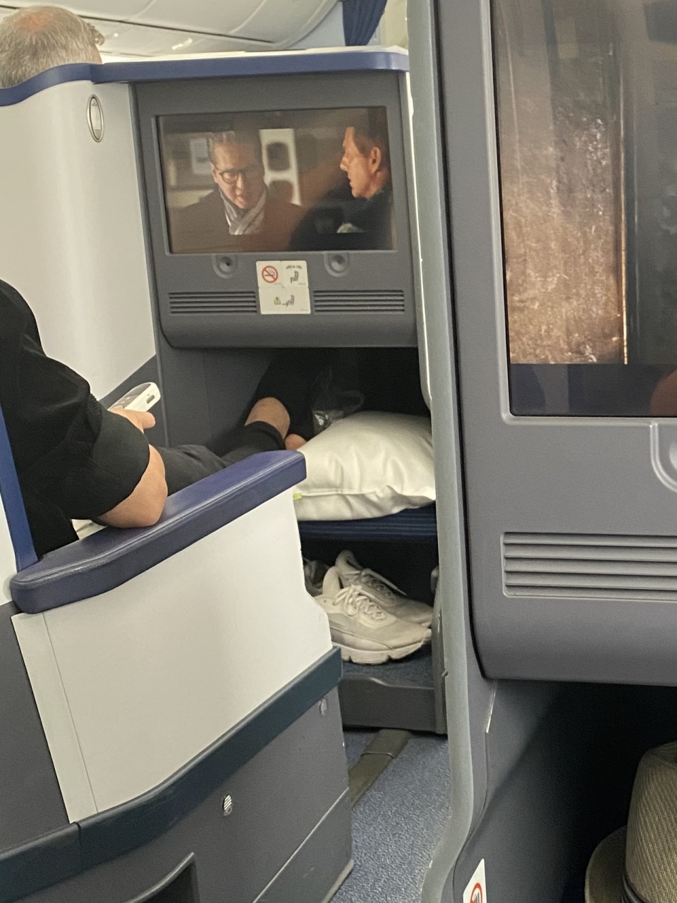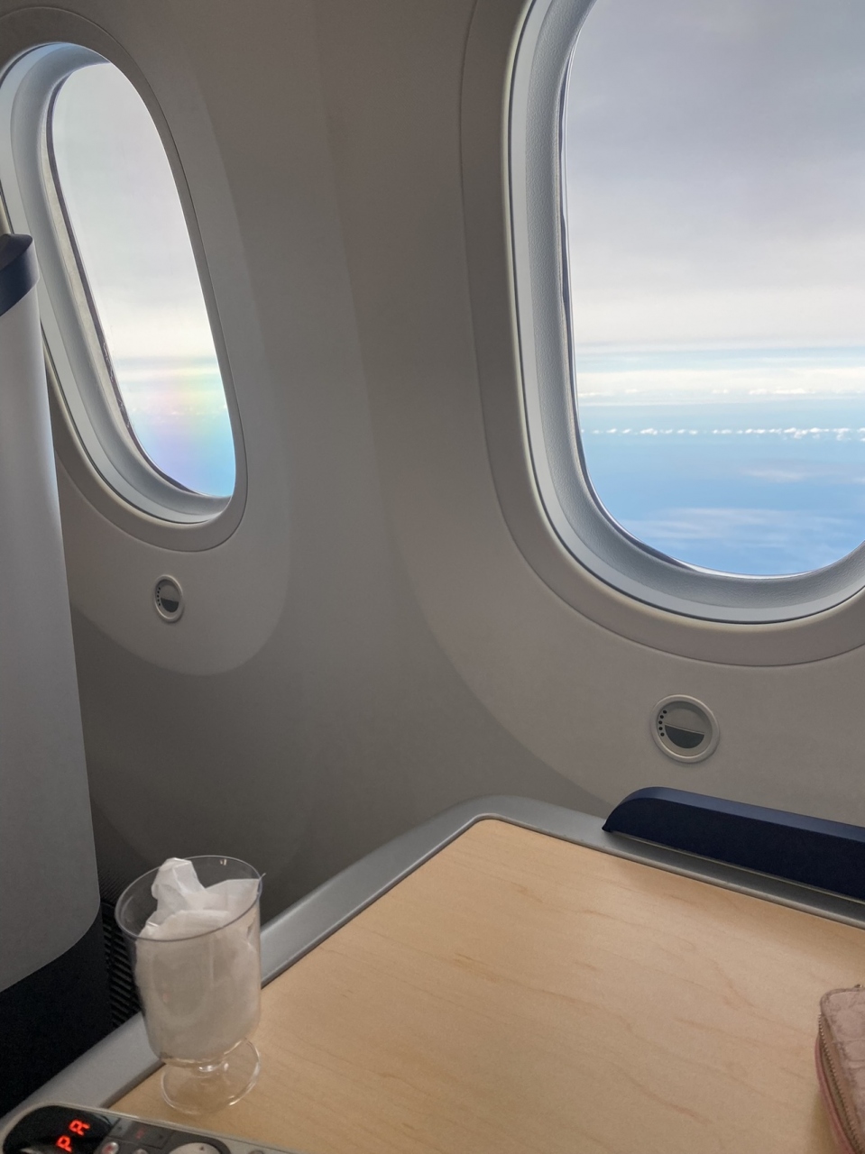 薄いマットをひき、軽くて温かいブランケットと枕で快適な空の旅でした。