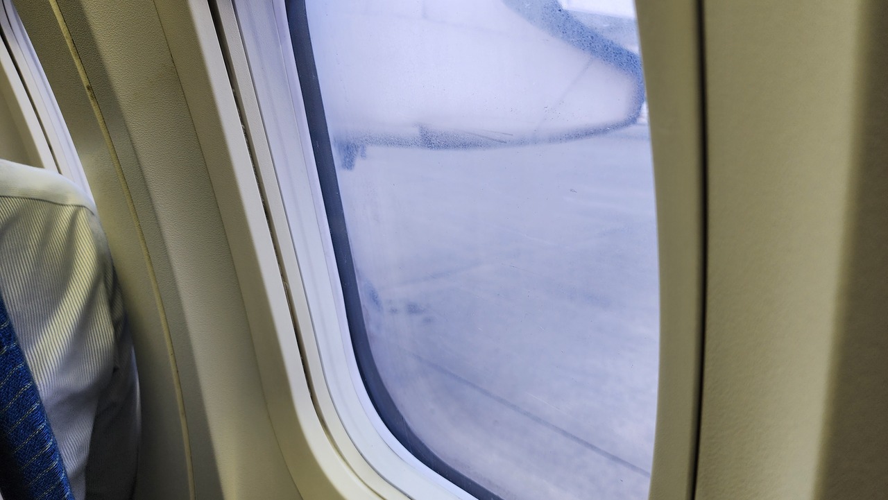 稚内札幌便。プロペラ機で高度が低く、天気の良い日は景色が楽しみな便です。あいにく雲が多く地上の様子はあまり見えず。それでも外の風景を楽しみたいところ、窓があまりにも汚くて、残念な飛行機でした。行きは千歳空港の通路をピーチの客が並んで通れなくなり、帰りはこのザマで、安定のANAです。