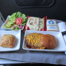 上空では、おしぼりのサービスと機内食が提供され、まずはナッツ系とジュース、続いて搭乗に注文していた機内食が出てきます。