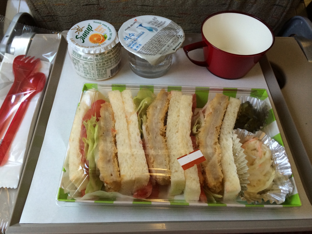 仁川から関空の便でもサンドイッチが出て嬉しかったです(味はあんまり美味しくない)。