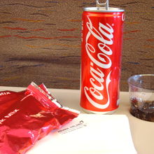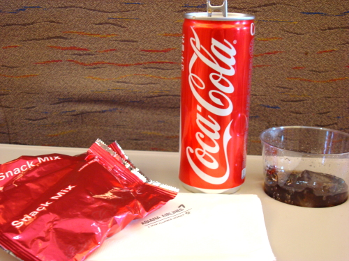 ドリンクは懐かしい細長い缶のコークとプリッツエルを2袋くれました。