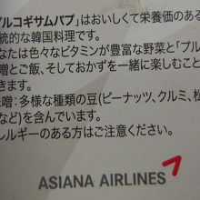 プルコギサムパプが出てとてもおいしかったです。ビビンバをはじめ機内食は全体的に味がいいと思います。ヨーロッパ便でも機内エンターテイメントの言語表示に日本語があり。子どもにはかわいいパズルをいただきました。歯みがきのためであろう人でトイレはやや混み気味。復路のフランクフルト発便で、搭乗から2-3時間空調が効かず不快でした。4便利用して遅延なし。CAさんも親切。日本の地方発便はエアソウルに移管されるようです。
