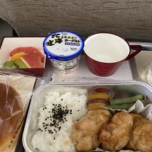 9時発の機内食はタレ絡めチキンとご飯、ヨーグルト、フルーツ、パン。おいしかった。朝便でメッチュの人多数(*^^)
