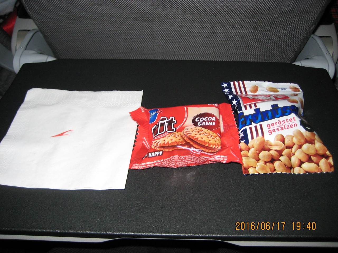 機内食は美味しかったですが途中で出たおやつ(軽食?)がピーナッツかクッキー?で駄菓子としか思えないものでした。今迄の飛行機ではパンやおにぎりだったのでびっくりです。