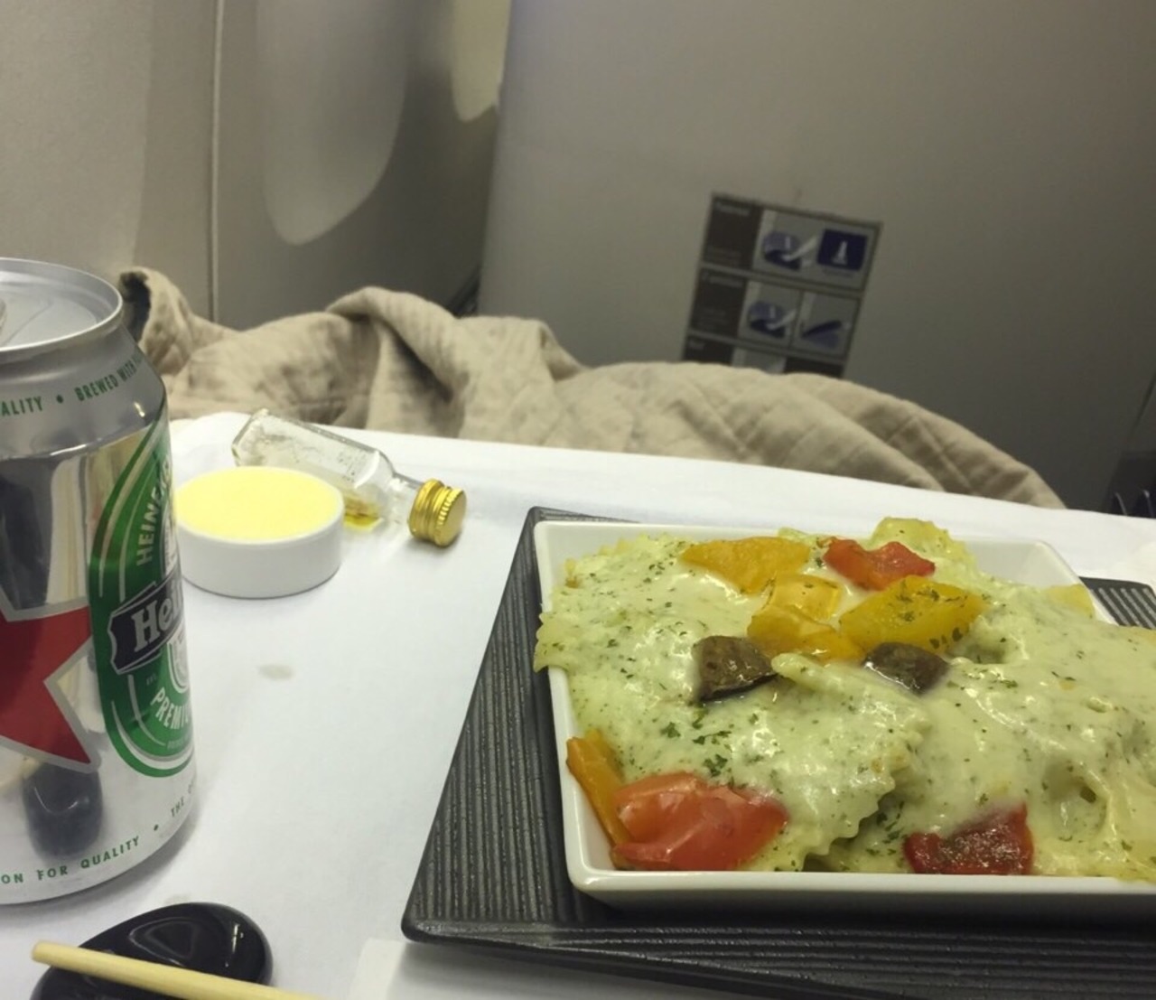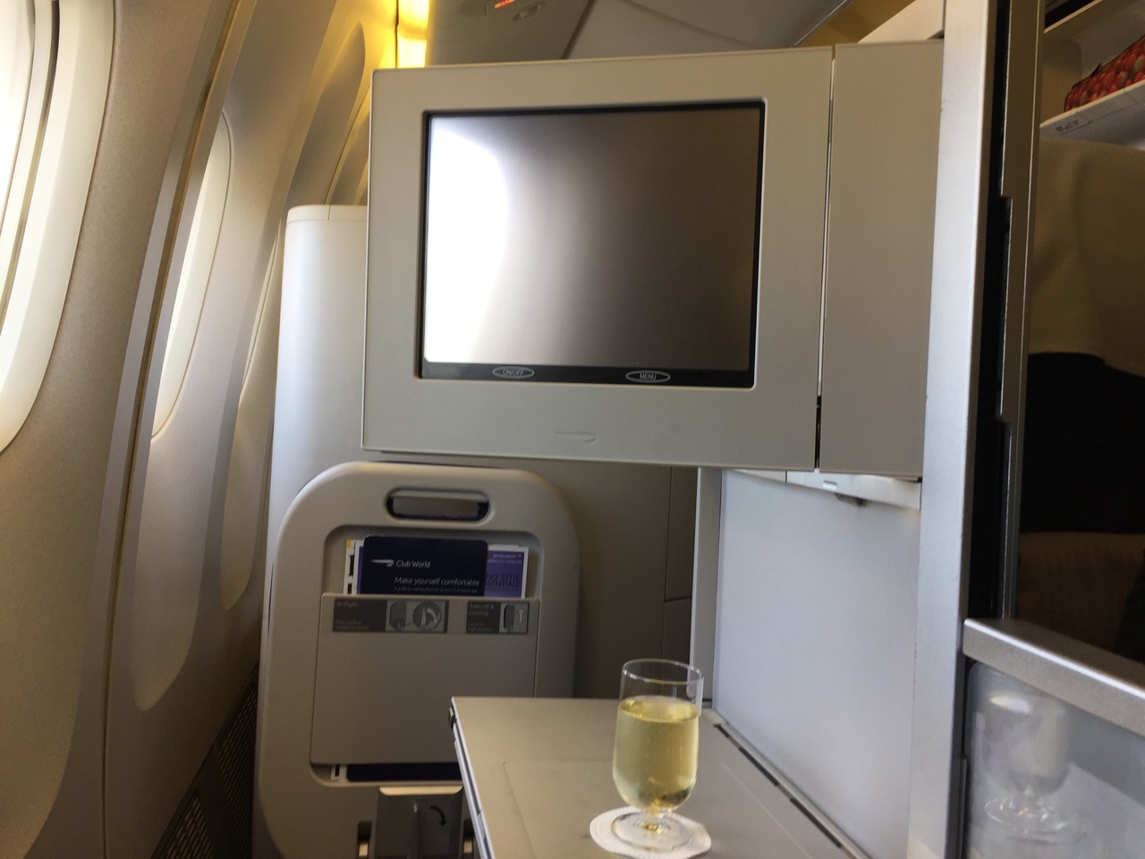 ビジネスクラスの座席の配列が変わっていて、私の座った席は窓側でしたが、進行方向とは逆方向の席でした。