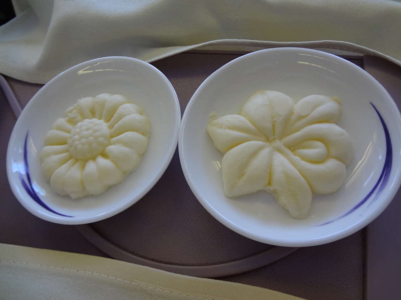 帰りの機内食では、パンに付けるバターに日本の花と台湾の花の細工が施されていて、細やかな心遣いを感じました。お料理も、日本の航空会社の物より美味しいと思います。
