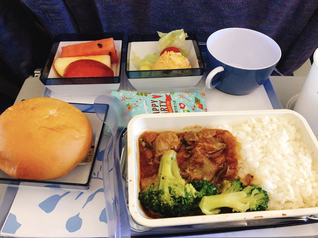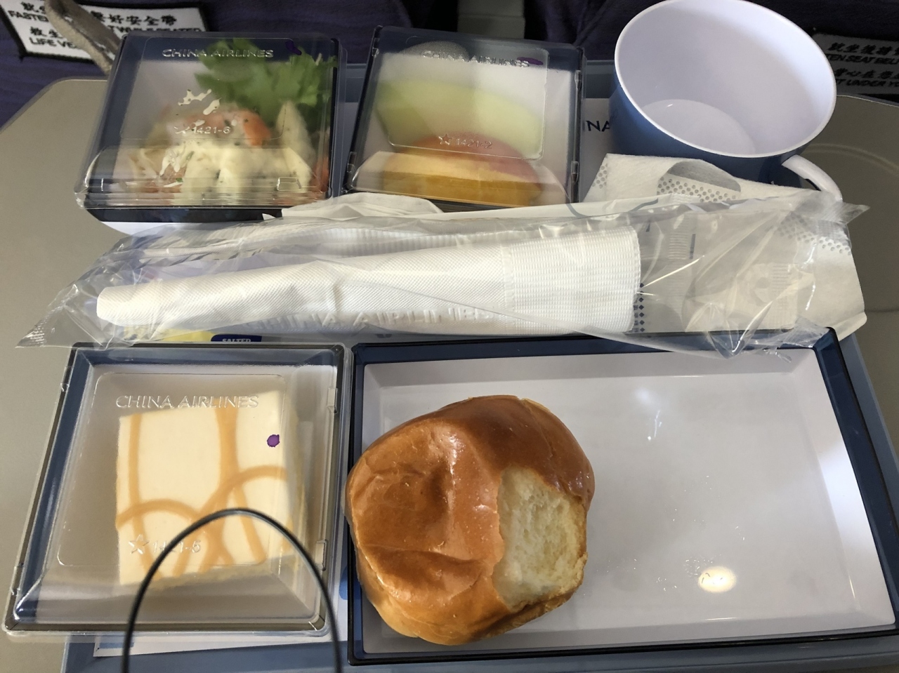 機内食が出ました。内容はチキンかパークから選べ、ライスとパン、バター、サラダ、フルーツ、行きのみケーキ付き、帰りのみ台湾のお土産のお菓子のようなものが付いてました。