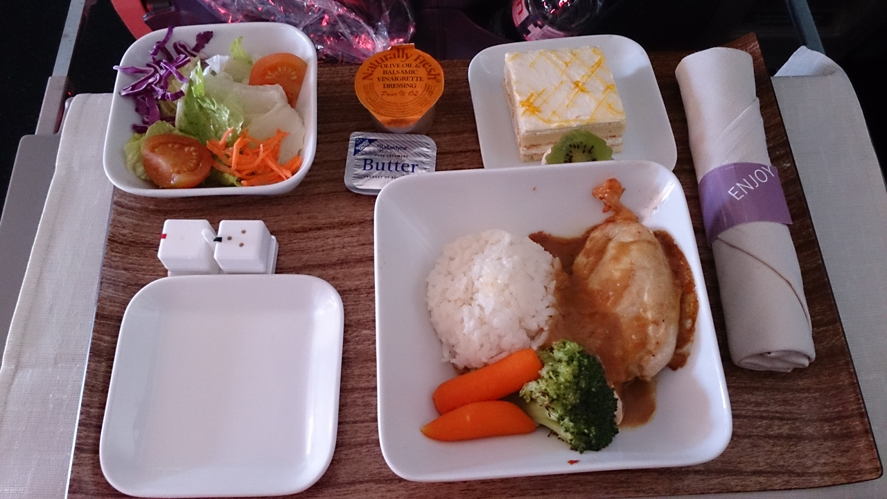ビジネスを利用しました。エコノミーに少し毛が生えた程度の席で、フットレストもプライベートモニタもありませんでした。エコノミー+20000円程度で乗れたので、こんなものかって感じです。料理はアメリカっぽくステーキなどもありました。僕は行き帰りともチキンにしましたがおいしかったです。