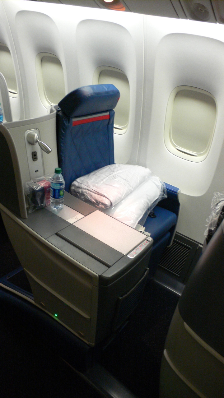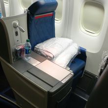 ペルーへの旅行にアトランタより往復利用しました。機材はB767-400でシートはスタッガード1-2-1配列でした。シート自体はフルフラットですが、足元が狭く寝返りが難しいことと座席周りに収納がほぼ無くペットボトルの収納にも苦労するほどです。機内食はメインは4種類(うち一種類はベジタリアン)から選べ味もなかなかです。サービス自体は欧米的なさっぱりしたものでさっと配って終了といった感じです。さらに機内販売が往復ともありませんでした。