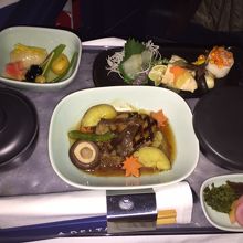 2017年9月に関空~ホノルルまで搭乗しました。初のビジネスクラスは最高でした。深夜便ということもあり、睡眠を第一と考えていたので、フルフラットで熟睡できました。和食を選択しましたが、ご飯は若干ぱさつきがあり、いまいちでした。しかし、それ以外は人参が紅葉の形であったりと、手が込んでおり、ボリュームもたっぷりでした。エンターテイメントは睡眠優先のため、全く使用しませんでした。