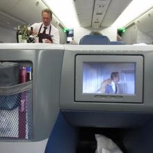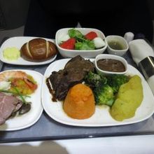 ラウンジで夕食を取ろうと思って行ってみると品数が少なくて驚いた。酒の肴の範囲。しかし、機内食はおいしかった。足下が両サイドから次第に狭くなり三角形のような形で先端は狭く寝返りを打ちにくい。CAは年配の男性であったが日本語を正しく話せた。