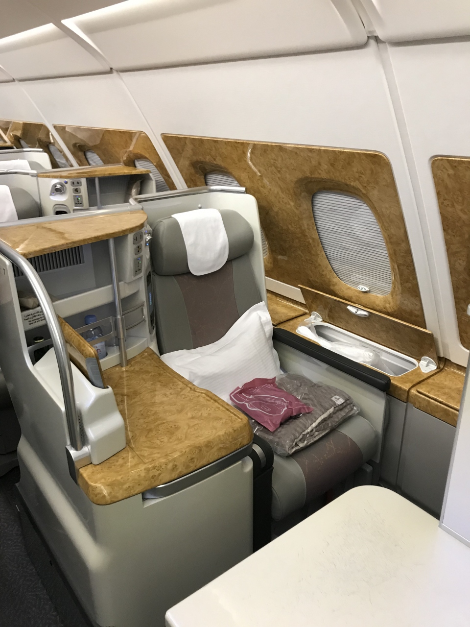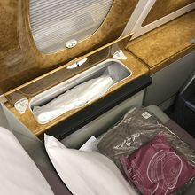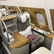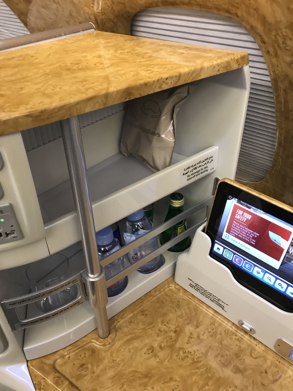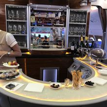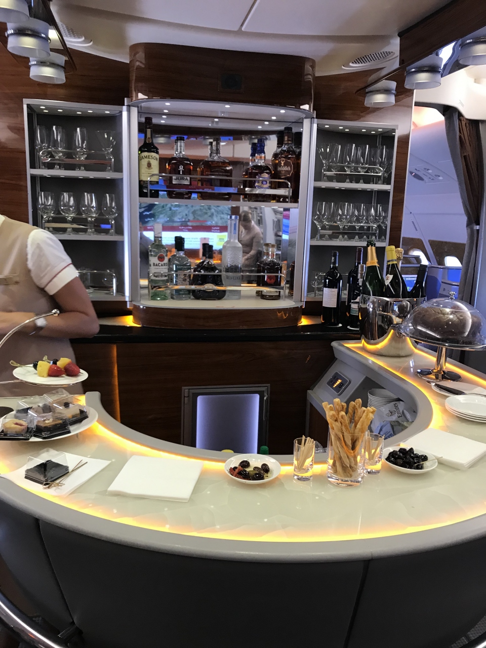 A380では、座席の一番後方にバーカウンターがあり、飲み物や軽食がいつでもいただけます。座席は収納も多くて良かったです。