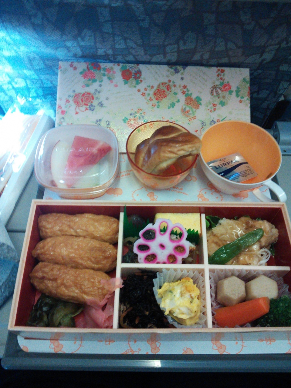 機内食は和食をチョイス。 キレイな折り詰めでていきょうされました。