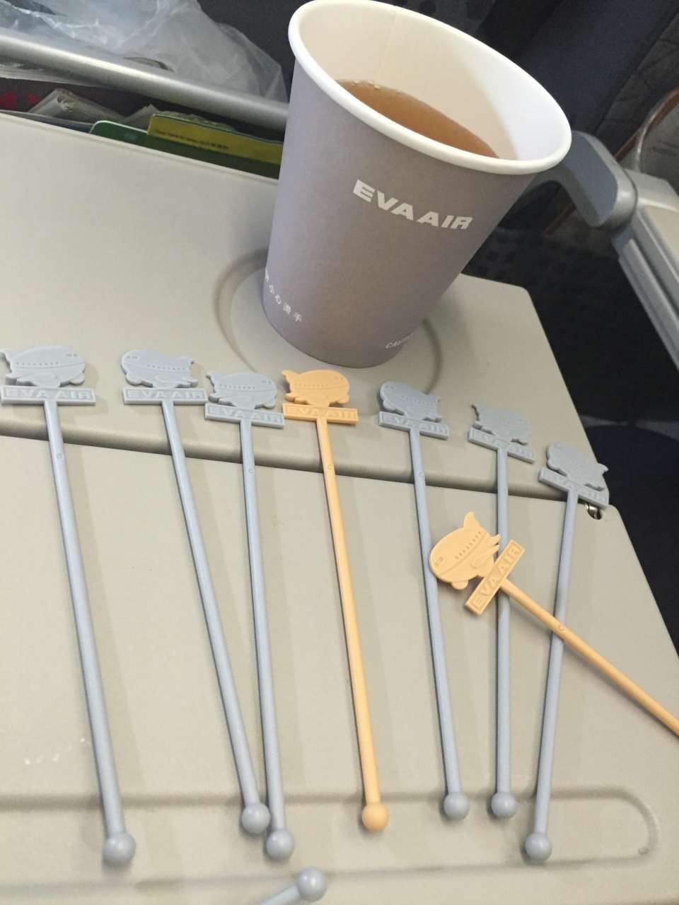 エバー航空、キティジェットだった頃に乗り、それ以来ファンです。羽田ー松山は普通の塗装になってしまいました。是非復活して欲しいです。今回はシーフードミールお願いしました。元々エバー航空はシーフードのメニューも有るのですが写真撮りたかったのでお願いしてみました。赤ワインの名前とラベルがかわいいので乗った時に見て頂きたいです。CAさんの制服も細かいところが素敵なので写真には撮れませんが見て欲しいです。細かいところ、コーヒーを飲む事が有れば是非マドラー頂いてください。