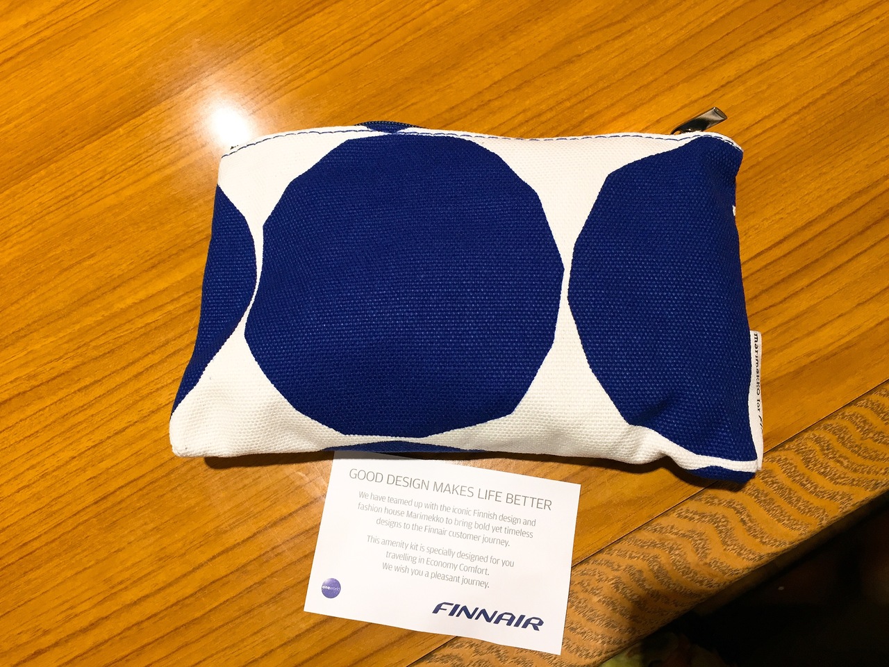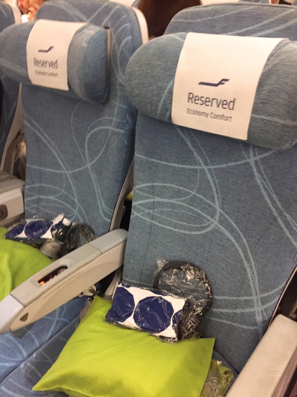 帰りは予約の段階からエコノミー・コンフォートクラスを追加料金を払って予約済みでした。 他の航空会社のエコノミー・コンフォートクラスは数万円追加とかなり高いイメージですが、フィンエアーは片道7500円ちょっとの追加でエコノミー・コンフォートを予約で来てかなりお得な感じ。 このくらいの追加で前の座席との広めのスペースやノイズキャンセリングのヘッドフォン、マリメッコの限定ポーチ入りのアメニティがもらえるなら、次回またフィンエアーを利用する時もエコノミー・コンフォートクラスを予約したいなと思いました!