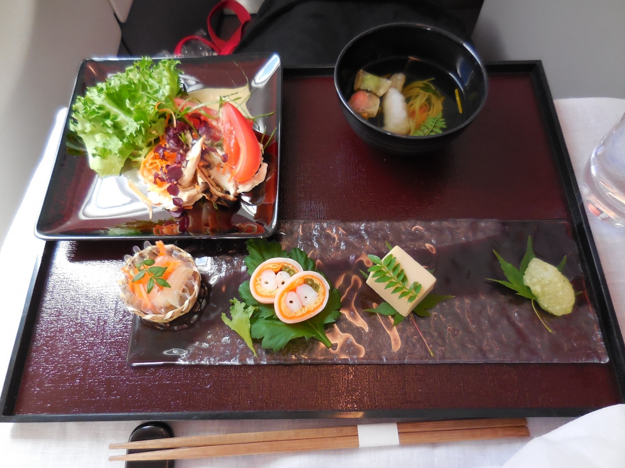 食事は回数も多く、いちいちセッティングしてくれて、見た目も綺麗だし、味もなかなかのもの!軽食の天ぷらうどんがなく、カップラーメンになったのは、ご愛嬌。