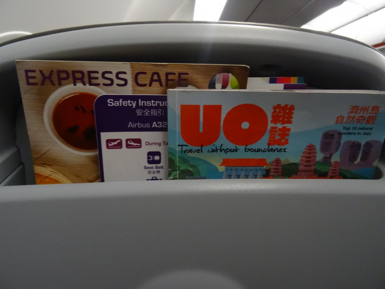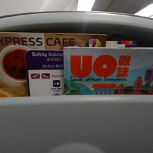 エンタメ設備はモニターがなくもちろん映画、音楽、ゲームなどなし。中国語の機内誌があるだけ。香港までだと4時間超かかるので、文庫本でも用意しておかないと退屈する。