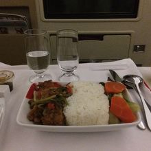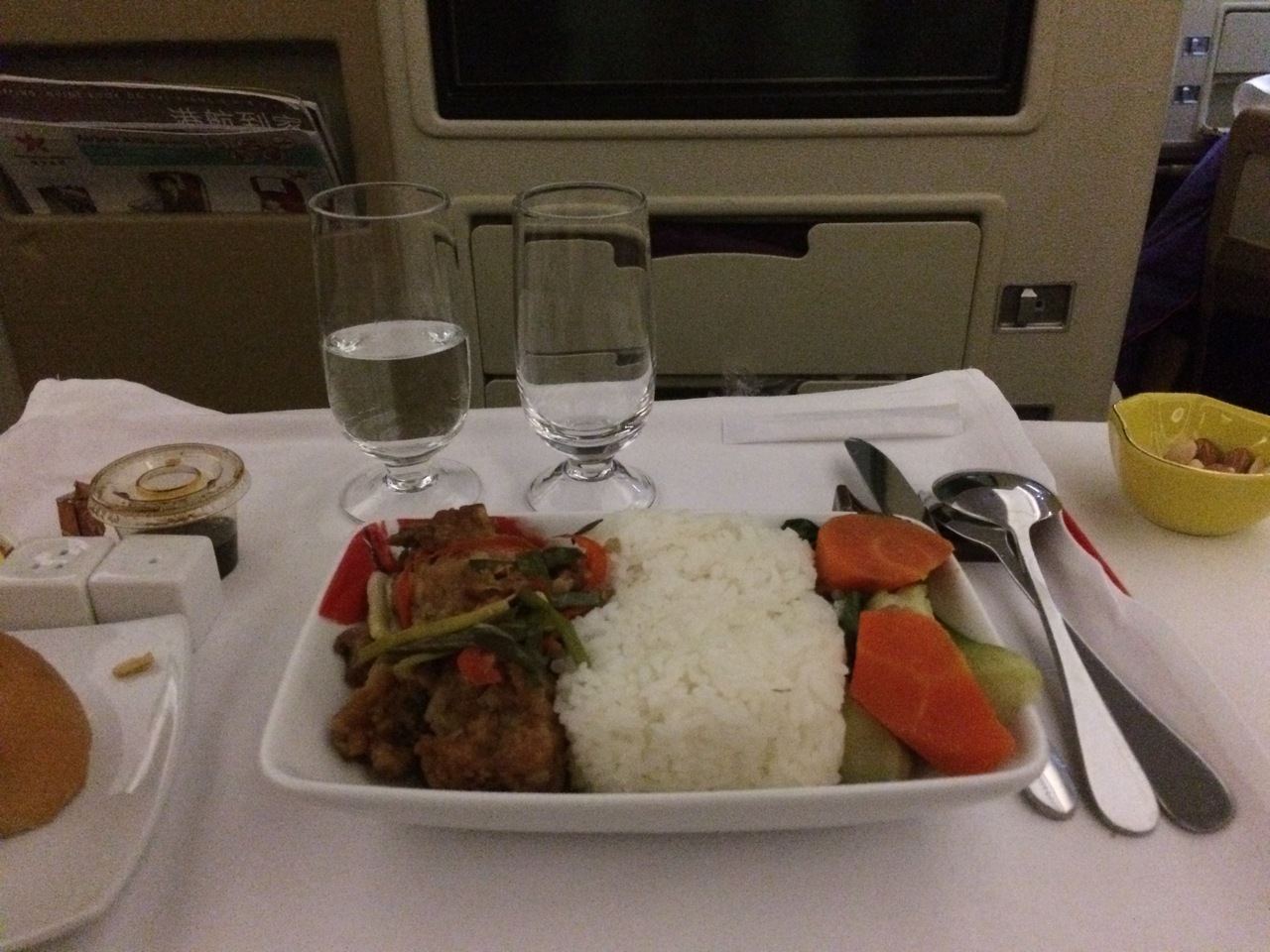 成田から香港まではビジネスといっても座席が少し広いくらいで大したことはありません。が、香港からバリ島へのフライトはいわゆるビジネスクラス仕様で、フルフラットシートでした。ただし、食事は正直あまり美味しくなく…シャンパンも甘ったるくて微妙。またCAの接客レベルも日系と比べると見劣りしました。ちなみにアメニティはスリッパだけです。