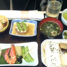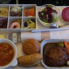 飛行機はビジネス2-2 エコノミー3-3の小さい飛行機でした。CAさんの接客対応はすばらしくいろいろと話をしていただきました。機内食は和食と洋食を選べました。行きは洋食帰りは和食にしました。洋食は味は良かったですが、量が多かったです。和食は、味噌汁が濃かった?よく混ぜてなかった?のが残念でした。