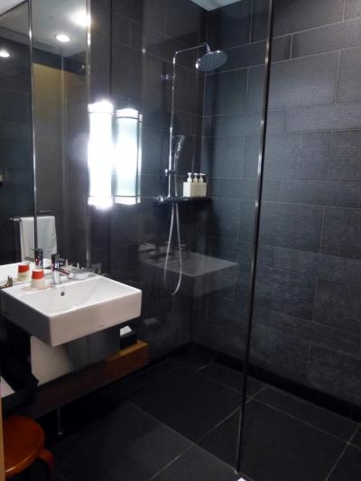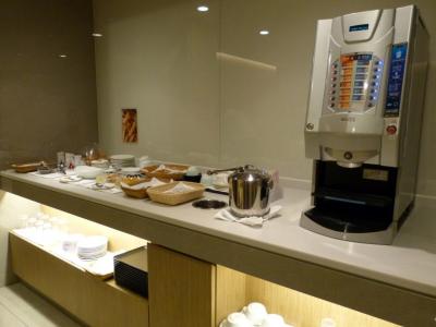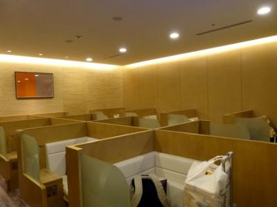 ラウンジ内は1人用のボックス席が並ぶ殺伐とした雰囲気で、食べのもは少なく、アルコール飲料もありませんでした。