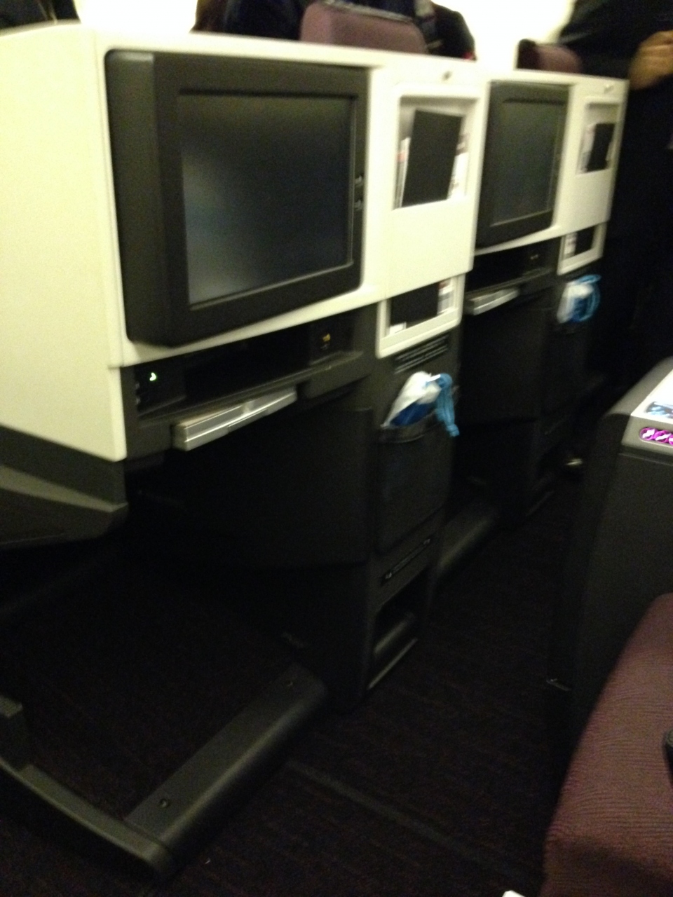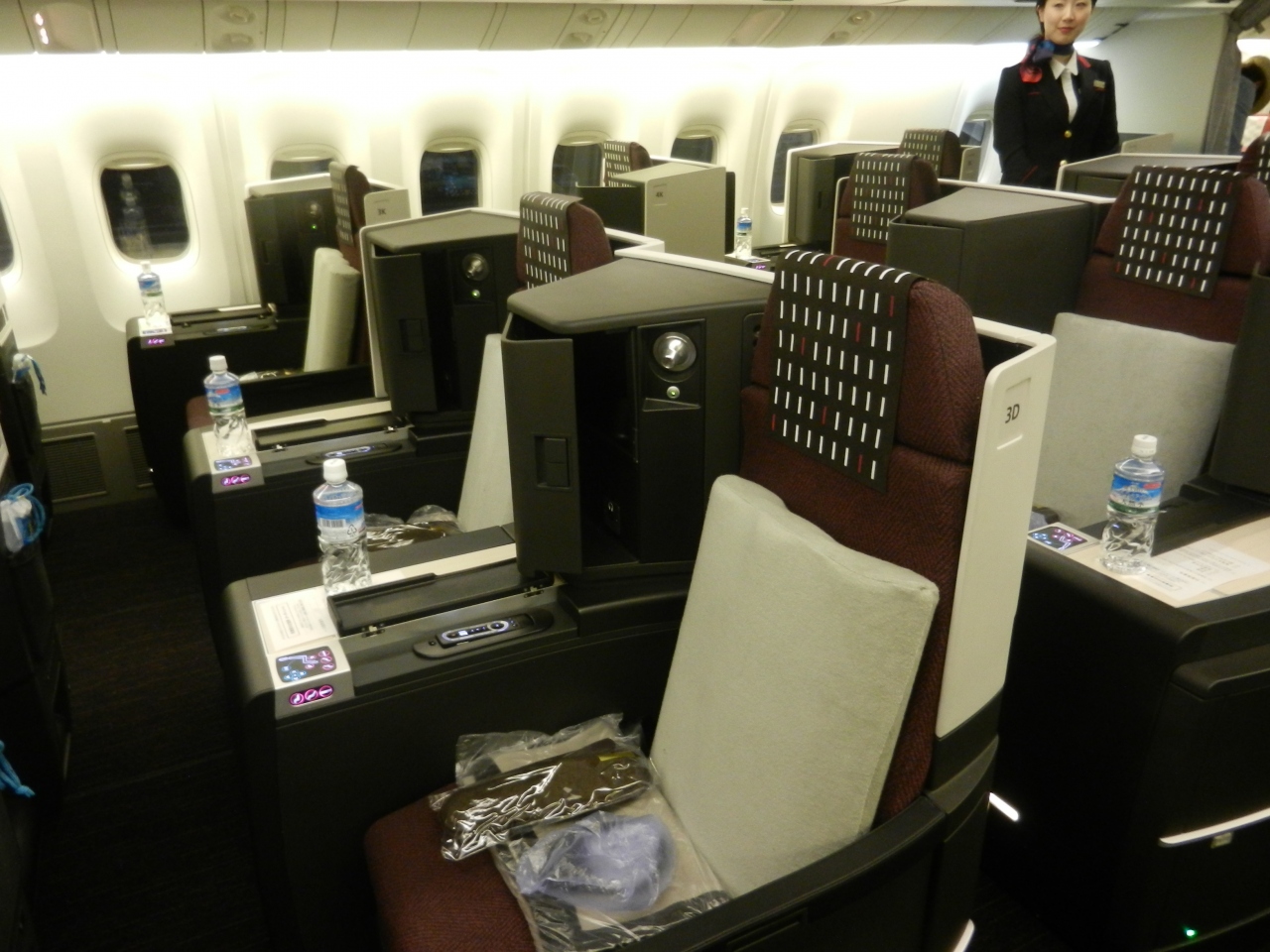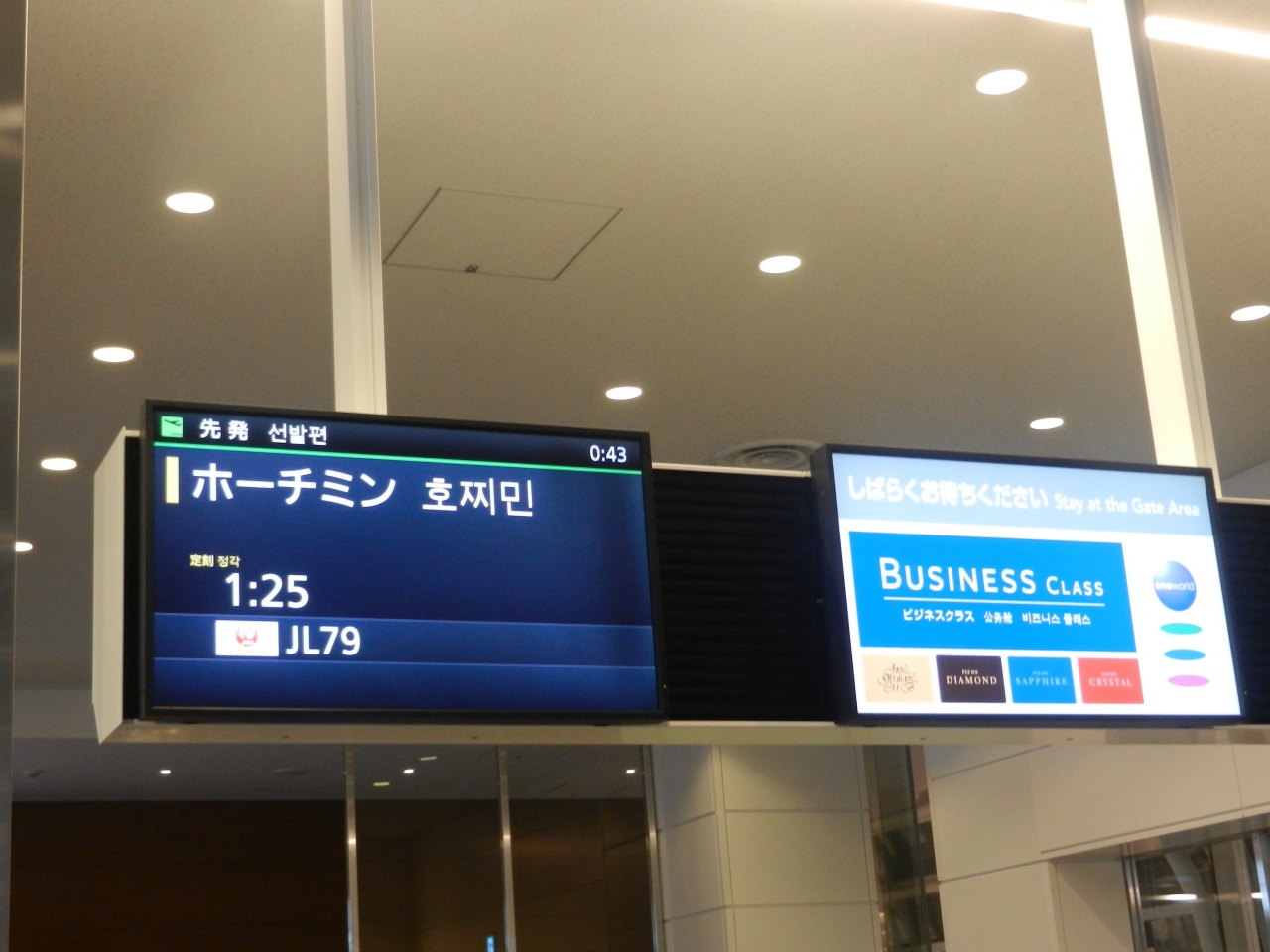 JL079便にてホーチミンへ。眠たくて我慢するのがシンドイ深夜1時に搭乗開始。今回はSKY SUITE767の新ビジネスクラスです。全席通路側のフルフラットシート。意外に奥行きがあります。