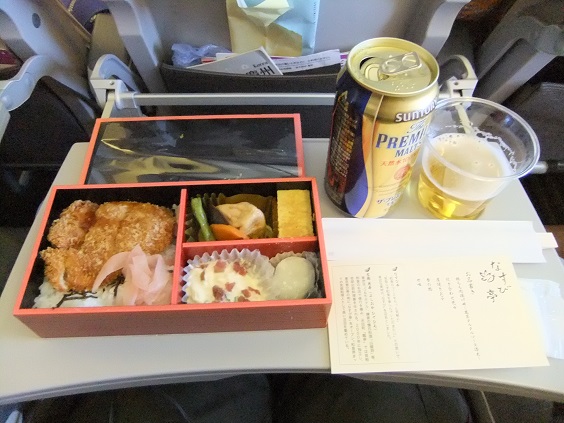 JL957便。10:50成田発の釜山行き。約2時間のフライトですが、食事(弁当)は出てきます。ボリュームは少なめに感じましたが、夕食の時間(19時くらい)まで何とか持ちました。その日は省エネ行動だったためかもしれませんが・・・