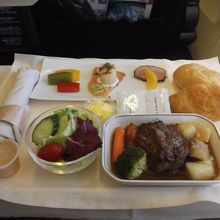 機内食は洋食と和食の2種類。私は洋食にしました。JALの機内食で不味いと感じたことはこれまで一度も無かったのですが、今回も大変美味しくいただきました。さすがはJALですね。