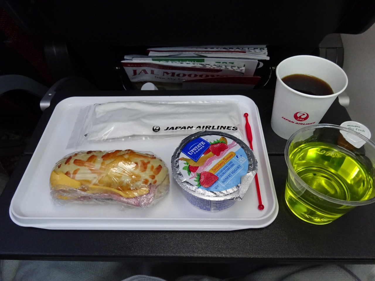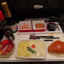 往路の機内食は,有名シェフ監修メニューでしたが,量が少なめ。…夜が遅い食事なので,軽めになっているのかも知れません。