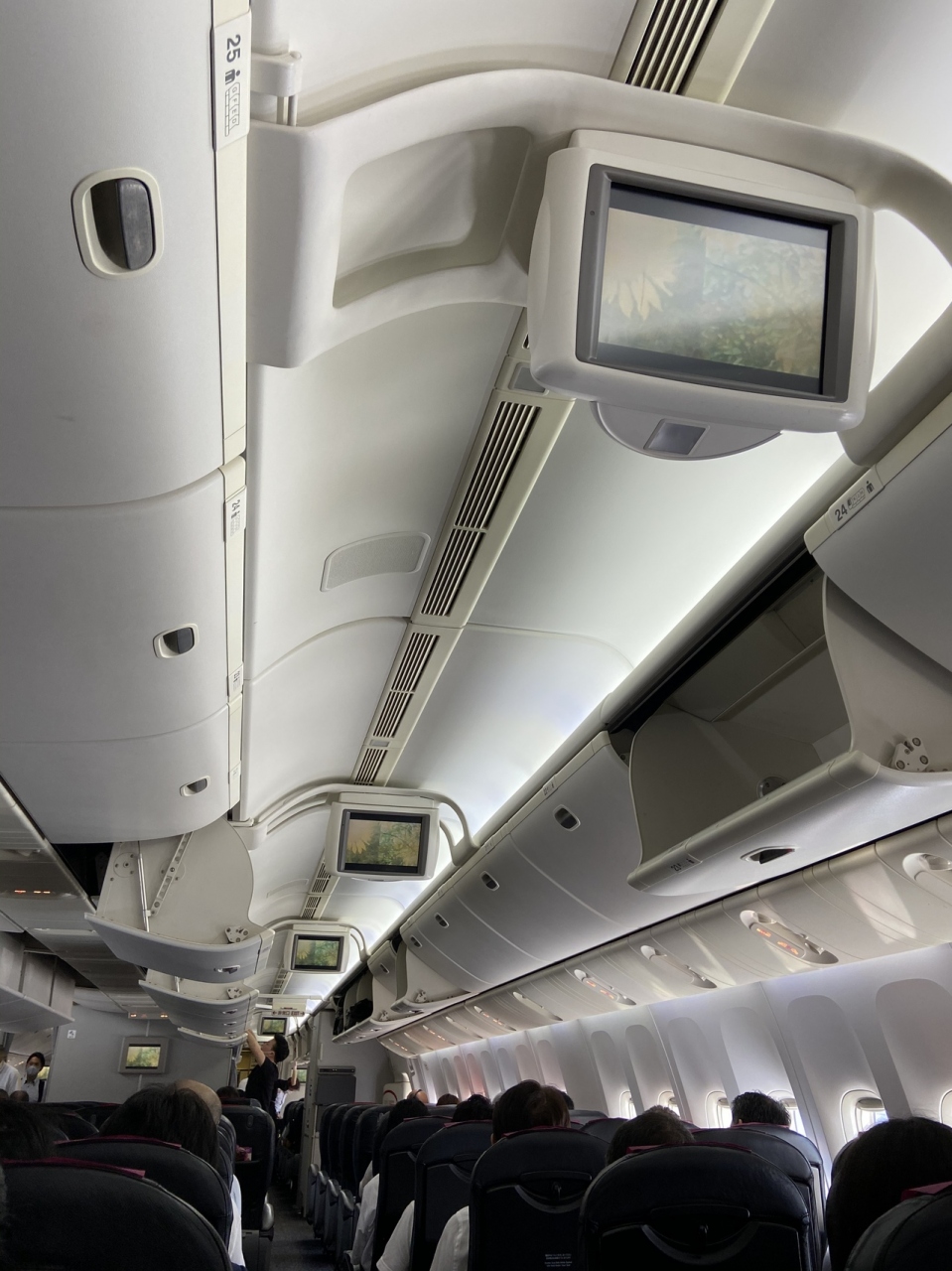 超久しぶりのフライトです。世間ではソーシャルディスタンスと言われてますが、機内はなるべく隣のお席は空席にするとか、工夫が見られますが、前後はかなり近いので密になってしまいます。エコノミークラスでは、毛布のサービスはなかったです。ワゴンでの飲み物サービスはやっていました。CAさんも大変だなって思います。