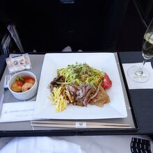 ラウンジではアルコールが飲めなくなっていたので,機上のシャンパン&森伊蔵は楽しめたのですが,なんと昼食は「冷やし中華」。…高級な食材を使っているのは解るのですが,とても残念でした。
