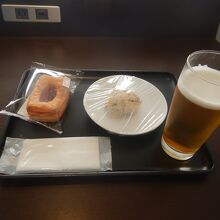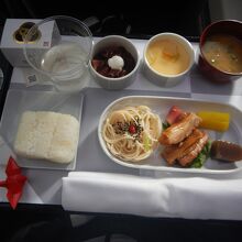 機内食はなかなかのもの。国際線のエコノミーの機内食よりはグレードが高い。アルコールも無料。ここではビールではなく日本酒を飲んでみた。