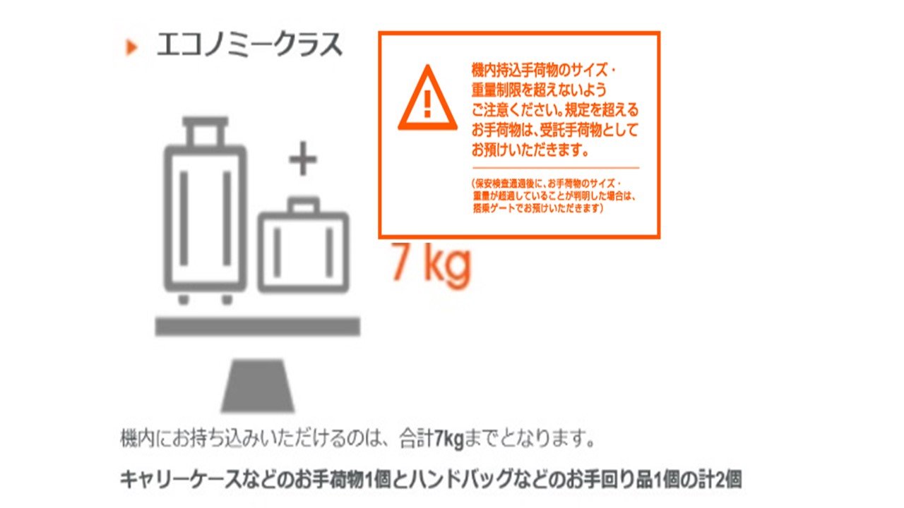 但し、事前の案内では、機内持ち込み手荷物の制限が厳しく、2個の手荷物合計の重量が7kgを超過する場合は、有料となると言うのです。